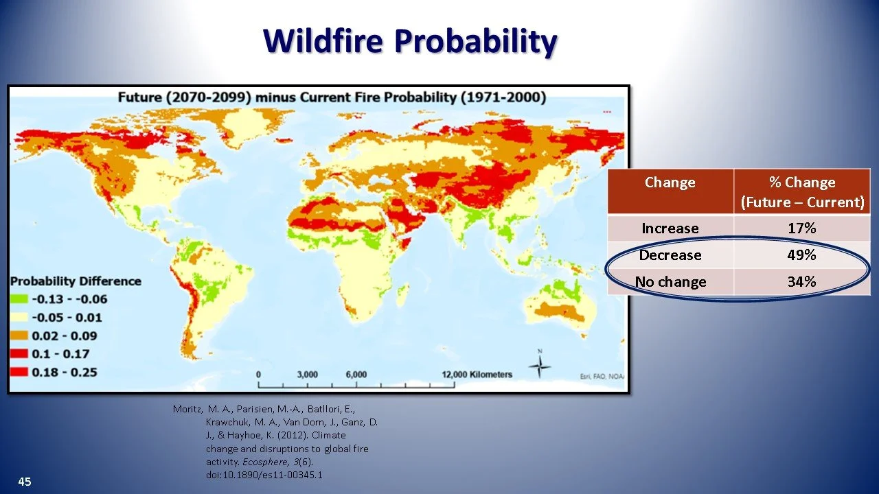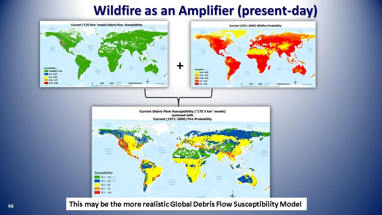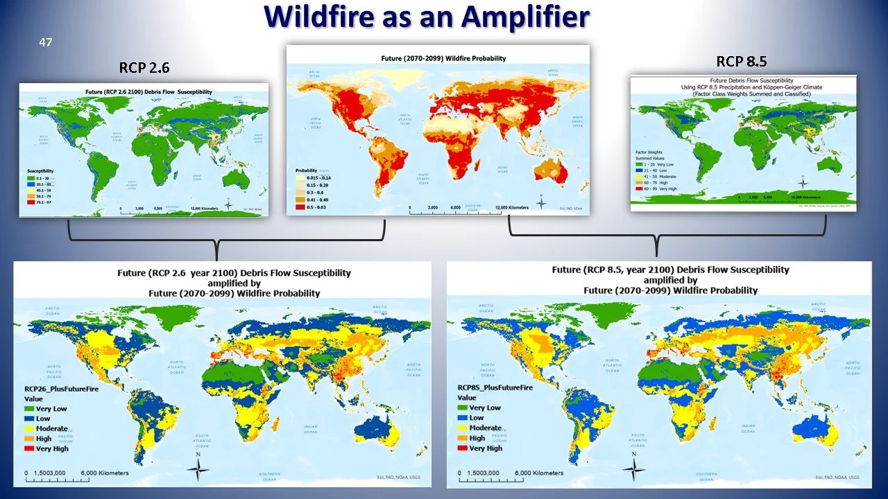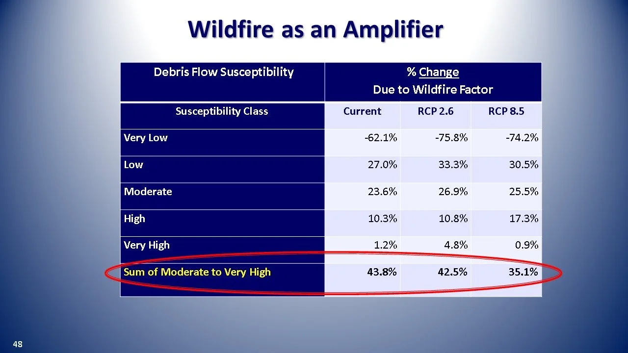 Let’s first look at future wildfire probability as an ancillary environmental factor to debris flow susceptibility and then glacier melt as a potential trigger.
